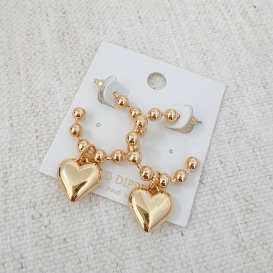 These earrings feature a modern ball hoop design with a lovely dangle heart. This cute and romantic piece adds a touch of love to any outfit.