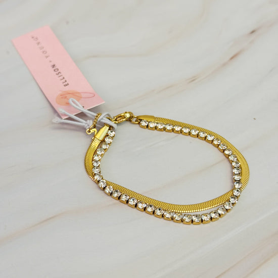 Introducing our Herringbone and Tennis Bracelet! Featuring a modern herringbone design that elegantly combines with a timeless tennis style, this bracelet is the perfect statement piece for any occasion.