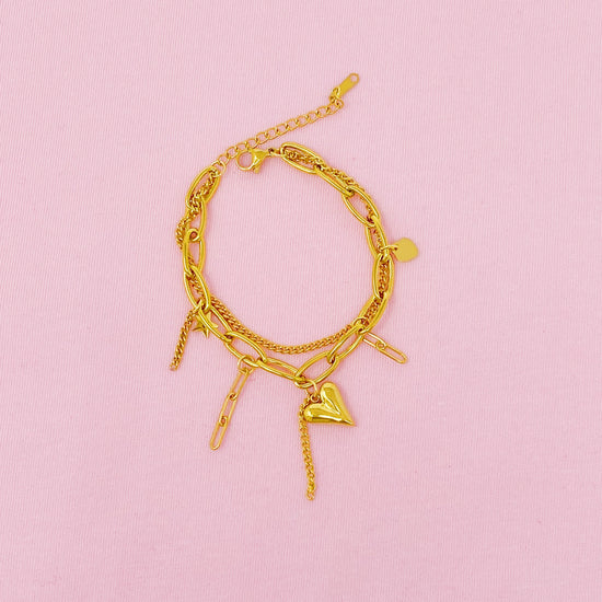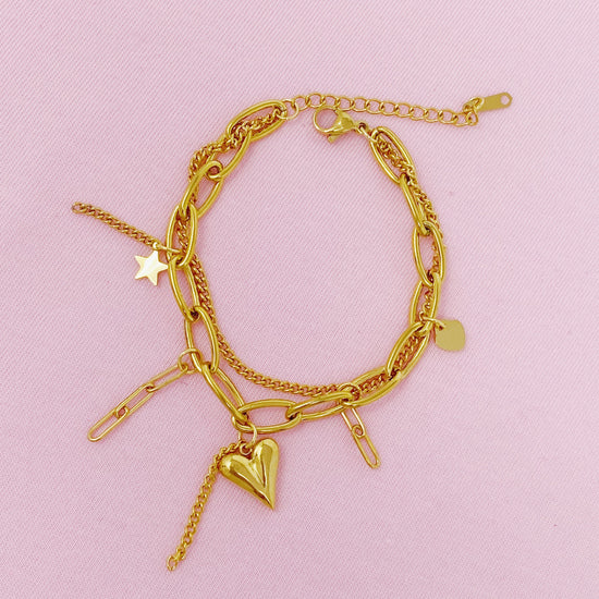 The perfect charm bracelet! It is a double chain bracelet with two different chain styles giving in character. The chunky gold chain is detailed with the cutest star and two heart pendents. A must have bracelet!