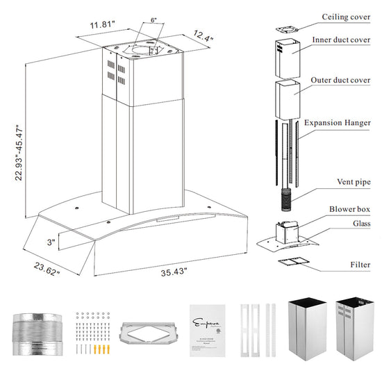 Empava range hood features 400 CFM airflow, button controls, a 3-grade speed fan, and a fully sealed aluminum motor. The 36" ducted range hood will quickly ventilate your kitchen and keep the noise level below 65 dB.