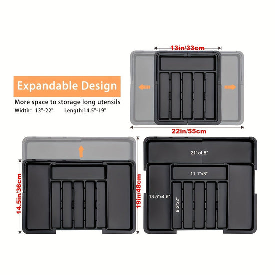 Keep your kitchen drawers neat and organized with the Black Expandable Kitchen Utensil Drawer Storage Box. This versatile storage solution features 9 compartments to organize cutlery, utensils, and kitchen tools. With an expandable design, it can be adjusted from 13 inches (33.0 cm) to 22 inches (55.9 cm) in width and 14.5 inches (36.8 cm) to 18.9 inches (48.3 cm) in length, allowing it to fit various drawer sizes. Made from durable plastic, this tray offers long-lasting use and easily accommodates forks, knives, spoons, and other kitchen utensils.