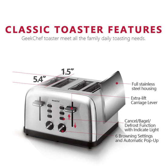 1.5" EXTRA-WIDE 4-SLOT TOASTER Extra Wide 4-slice Toaster for you, toasting thin bread, thick bagel, English Muffin with Easy!CANCEL, BAGEL and DEFROSTIt features with Cancel, Bagel, and Defrost functions. Toasting the bread easy by pressing the button, breakfast will be ready fast. One press "CANCEL" to stop toasting, "Bagel" for thick bread/bagels, and "Defrost" for recover room temp.6 TOAST SHADE SETTINGS6-level settings and Automatic Pop-Up Toaster - 6 accurate shade modes for your option to prepare your favorite taste bread. Warm-up, light brown, golden brown, crispy, and dark satisfied with your taste.DUAL INDEPENDENT CONTROL PANELSDual Independent Control Panels It equivalent to 2 toasters, prepare breakfast twice fast than a 2-slice toaster! Easy to Clean with Removable Crumb Tray!WARRANTY & SERVICEBPA-free Security and Warranty, Contact us via email, we will reply and resolve your problem ASAP.